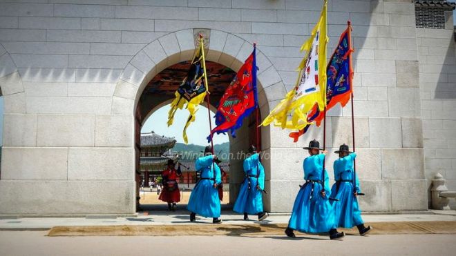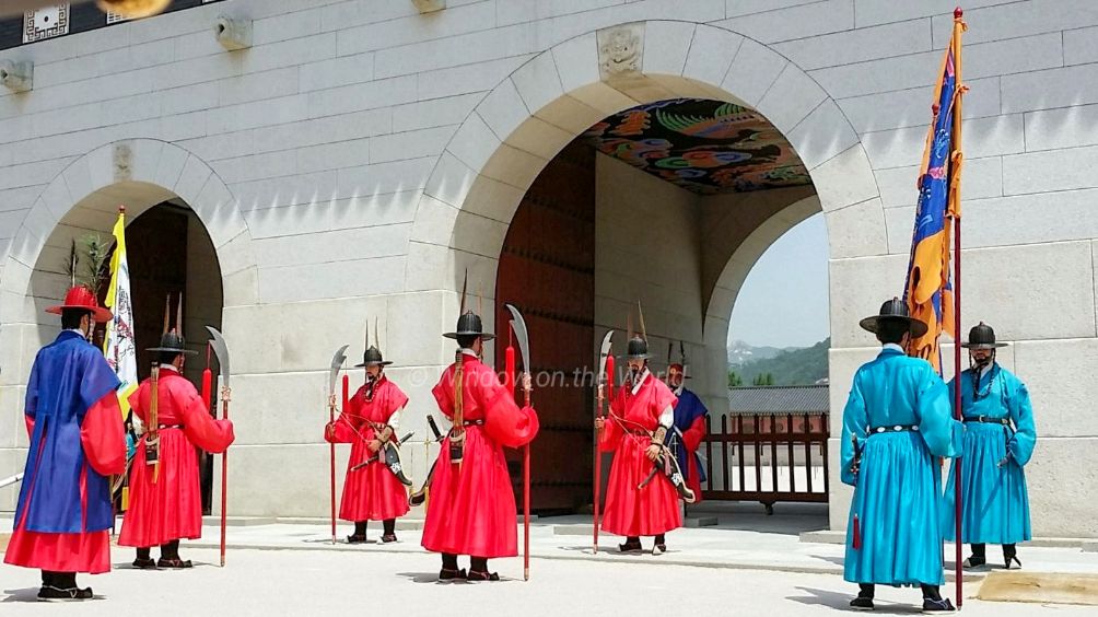 A soldier at the main gate.The changing of the Guards ceremony at Gwanghwamun, the main gate.The changing of the Guards ceremony at Gwanghwamun, the main gate.The changing of the Guards ceremony at Gwanghwamun, the main gate.New guards are in place.
