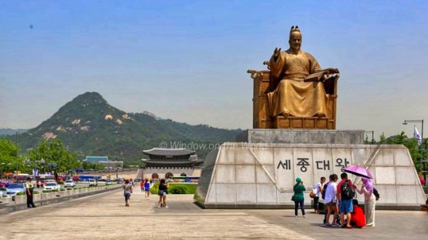 The statue dedicated to the 15th century Korean monarch, Sejong the Great, the fourth king of Joseon dynasty and one of Korea’s most famous historical figures. He personally created and promulgated the Korean alphabet Hangul,