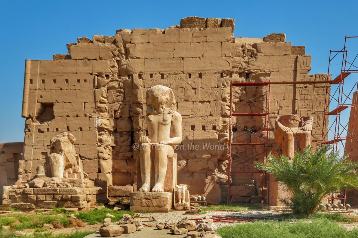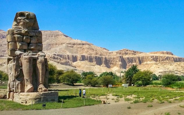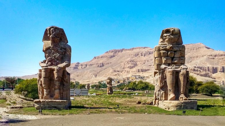 The Colossi of Memnon are two massive stone statues of the Pharaoh Amenhotep III, who reigned in Egypt from 1386 BC till 1353 BC. The Statues have been sitting in the Theban Necropolis since 1350 BC. They were constructed as guardians for Amenhotep III’s mortuary complex which once stood behind them. The statues rise 60 ft (18 meters) high and weigh 720 tons each; both carved from single blocks of sandstone.
