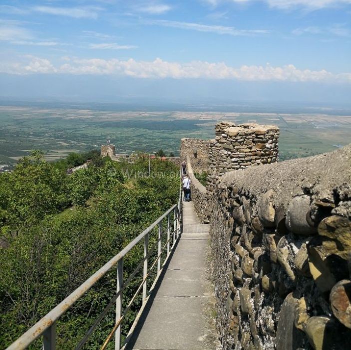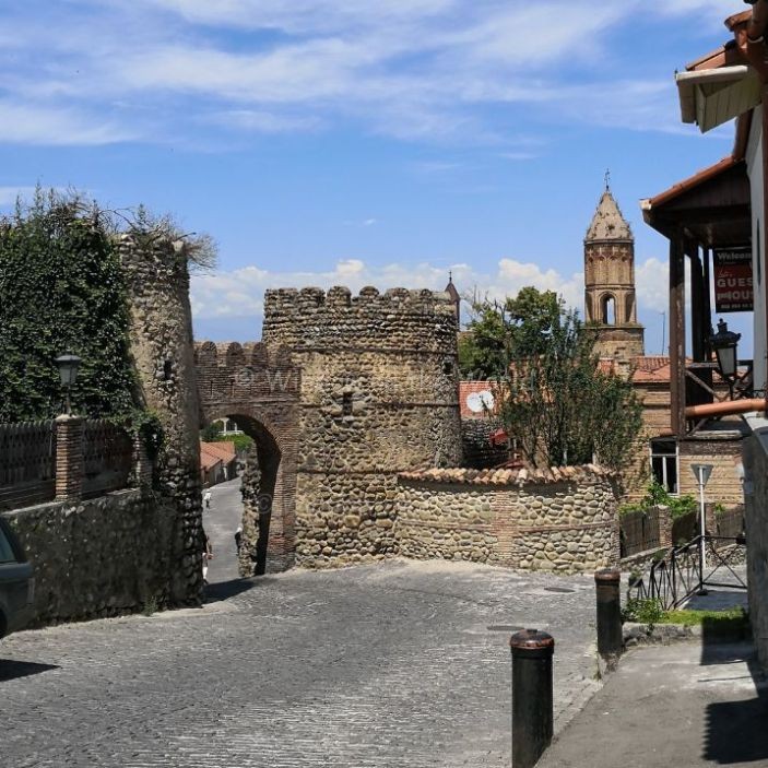 The town of Sighnaghi has cobblestone streets, a well-preserved old city wall, and charming houses.A beautiful Church of St. George and its Bell tower.The City Wall is an impressive remnant of the medieval past. The wall is more than 4 KM long, has 23 towers, all of which are named after the town at the end of the road that passes through each gate.One of 23 towers of the Sighnaghi City Wall.4 KM long Sighnaghi City Wall overlooking the Alazani Valley.At the city wall of Sighnaghi.The picturesque town of Sighnaghi.The Coat of Arms of the city of Sighnaghi, also known as ‘The City of Love.’ It’s possible to get married 24 hours a day in Sighnaghi, so many Georgians come here to wed their loved ones.