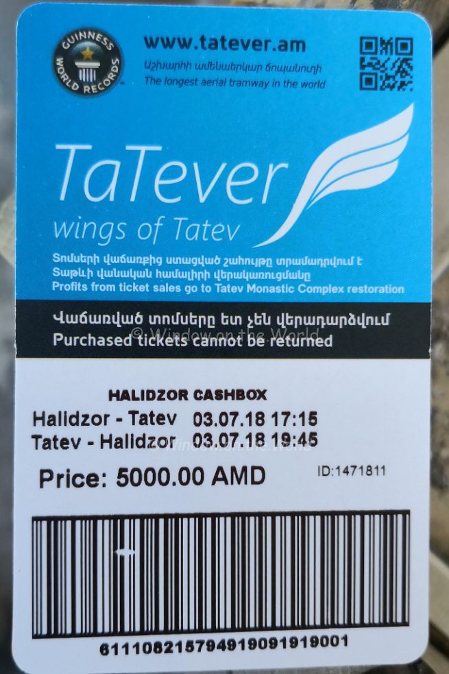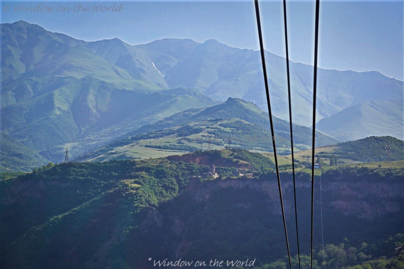 Lunch at a roadside traditional Armenian restaurant where a group of women were making fresh Lavash, a traditional thin bread, now on a UNESCO Intangible Cultural Heritage Lists.The Gates of Zangezur – welcoming you to Syunik Marz region in Southern Armenia. In the past, Tatev was difficult to reach, because the winding road had to descend the steep walls of a gorge, and cross a river on the Devil’s Bridge, but now Tatev is easily accessible by Wings of Tatev, the world’s longest reversible cable car. Wings of Tatev was included in the Guinness World Records as “world’s longest non-stop double track cable car”.View from the Wings of Tatev.View from the Wings of Tatev, the first sight of Tatev Monastery.
