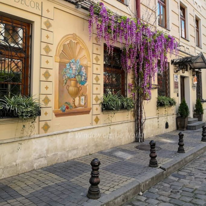 Beautiful flowers outside a restaurant in the old town.Cobblestone streets of Lviv old townOld city wall restored and converted in to an upscale Restaurant A Manhole cover with City’s coat of Arms