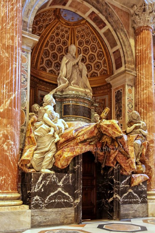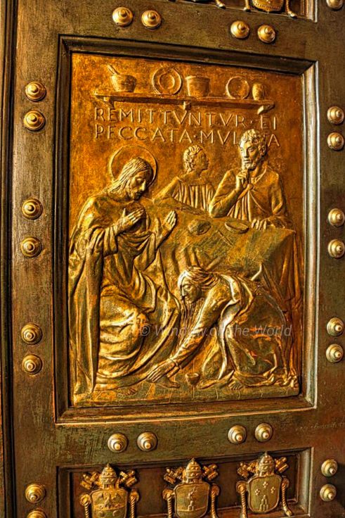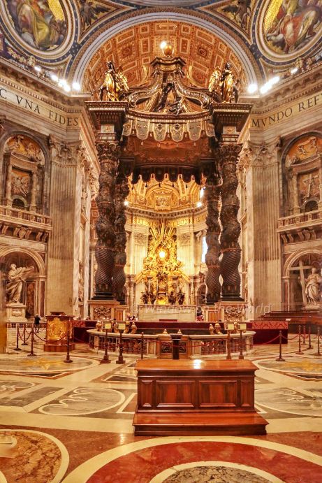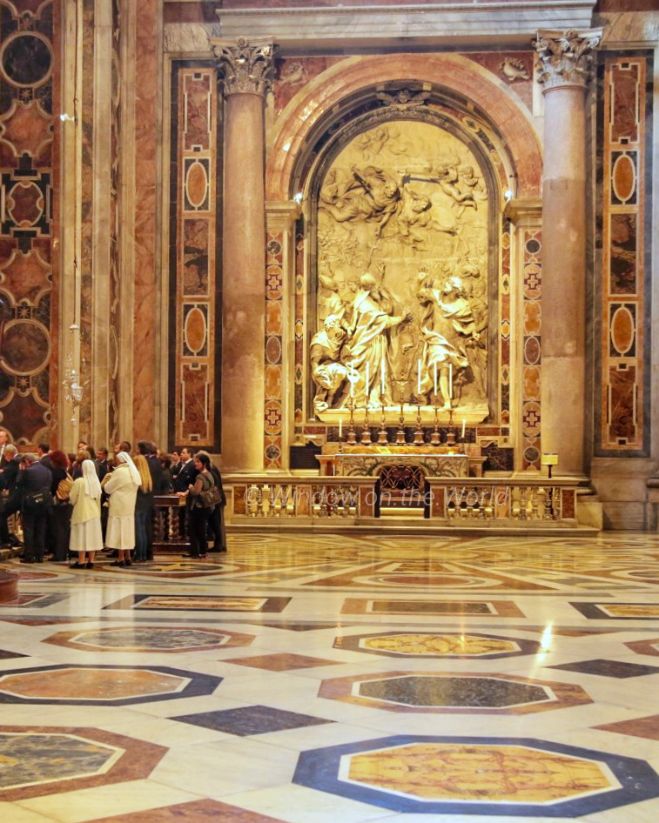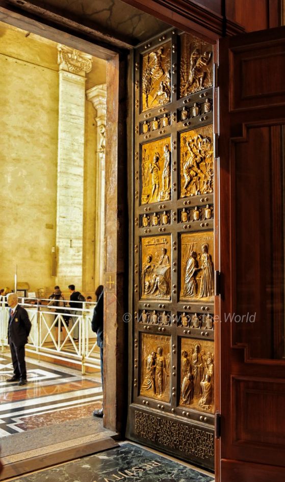 October 2016, the time I visited, Pope Francis announced The Extraordinary Jubilee of Mercy from 8 December 2015 to 20 November 2016. Pope Francis declared, “The Holy Door will become a Door of Mercy through which anyone who enters will experience the love of God who consoles, pardons, and instills hope.” One of 16 Biblical scenes on the Holy Door focusing on stories of mercy and forgiveness. The current Holy Door made of bronze was carved in 1948 by Vico Consorti. Welcome to the Vatican City. A beautiful manhole cover depicting coat of arms, birds and flower patterns. The bronze statue of Saint Peter holding the keys of heaven. According to Catholic teaching, Jesus promised the keys to heaven to Saint Peter, empowering him to take binding actions. The statue has long been regarded as having been created in the 5th century, commissioned by Pope Leo I (440-461), but modern analysis has dated the statue to the 13th-14th c.Maderno’s nave, looking towards the chancel. Carlo Maderno appointed as chief architect of St Peter’s in 1603, was forced to modify Michelangelo’s plans for the Basilica and provide designs for an extended nave with a palatial façade.St. Peter’s Baldachin, a large Baroque sculpted bronze canopy, directly under the dome of the basilica, was created between 1623 and 1634, by Lorenzo Bernini, marks the place of Saint Peter’s tomb underneath. Under its canopy is the high altar of the basilica.