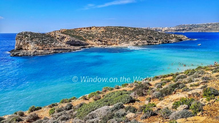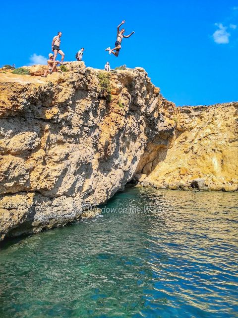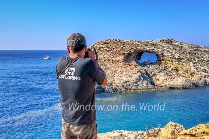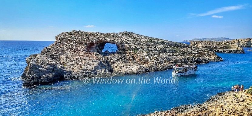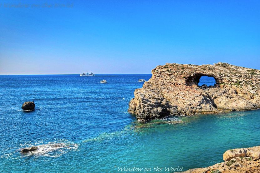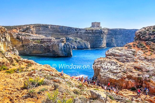 Cominotto, an uninhabited island, that lies 100 meters to the north-west of Comino. The Blue Lagoon is a shallow, a narrow channel between Comino island and Cominotto. It’s basically a giant swimming pool. The water is calm, shallow, and crystal clear. It’s a good place to snorkel or just enjoy the warm water.Saint Mary’s Tower, also known as the Comino Tower, a large bastioned watchtower built in 1618, the fifth of six Wignacourt towers. The tower was used by the Armed Forces of Malta until 2002. Below the steep cliff supporting St Mary’s Tower are the sparkling blue seas of the Crystal Lagoon. Less known only because the Blue Lagoon outshines it.Comino Chapel, The Chapel of the Return from Egypt or simply St Mary’s Chapel, a Roman Catholic church, the only church located on the island of Comino. The chapel of St Mary was first mentioned in a map dating from 1296, though current structure was built in 17th century and opened for public worship in 1716.A big hole on Cominotto island, looks natural, not something caused by a cannonball. The rocky island of Comino is a bird sanctuary and nature reserve and very few people live there permanently. The peaceful landscape consists of cliffs, two small white sand beaches, coves and creeks. There are no roads or cars in Comino, only pathways where you can hike or ride a bike.During summer months many visitors, domestic and foreign, enjoy blue lagoon. Like many islands in Mediterranean Sea, Maltese islands have rocky shores and no forest on any of its islands.Young people jumping off the cliff.